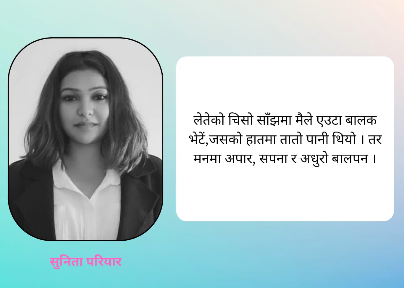 यात्राको क्रममा मैले धेरै बालबालकहरूलाई होटेल, रेस्टुरेन्टमा काम गरेको देखेको छु । बस, माइक्रो जस्ता सार्वजनिक सवारी साधनमा सहचालक भएको भेटेको छु । तर उनीहरूको त्यो अवस्था बाध्यता थियो, बालपनको स्वतन्त्रता र शिक्षा पाउने अधिकारभन्दा बाहिरको जीवन । जहाँ अभाव, कठिनाइ र जिम्मेवारीले बाल्यकालको स्वतन्त्रता छिन्ने प्रयास गर्छ, त्यहाँ हाम्रो सहकार्य, समर्थन र संरक्षणले मात्र उनीहरूको भविष्य सुरक्षित रहन्छ । सुमितको मुस्कान र हिम्मतले मलाई एउटा स्पष्ट पाठ सिकायो, कठिन परिस्थितिमा पनि आशा र सपना जीवित रहिरहन्छ । त्यसका लागि समाज, परिवार र सरकार सबैको जिम्मेवारी अत्यन्तै महत्वपूर्ण हुनुपर्छ । समाजले पनि केवल गुनासो गर्ने होइन, बालश्रम, बालअधिकार उल्लंघन र बालबालकको शिक्षा , स्वतन्त्रता हनन् हुने घटनाहरूको सक्रिय विरोध गर्नुपर्छ ।