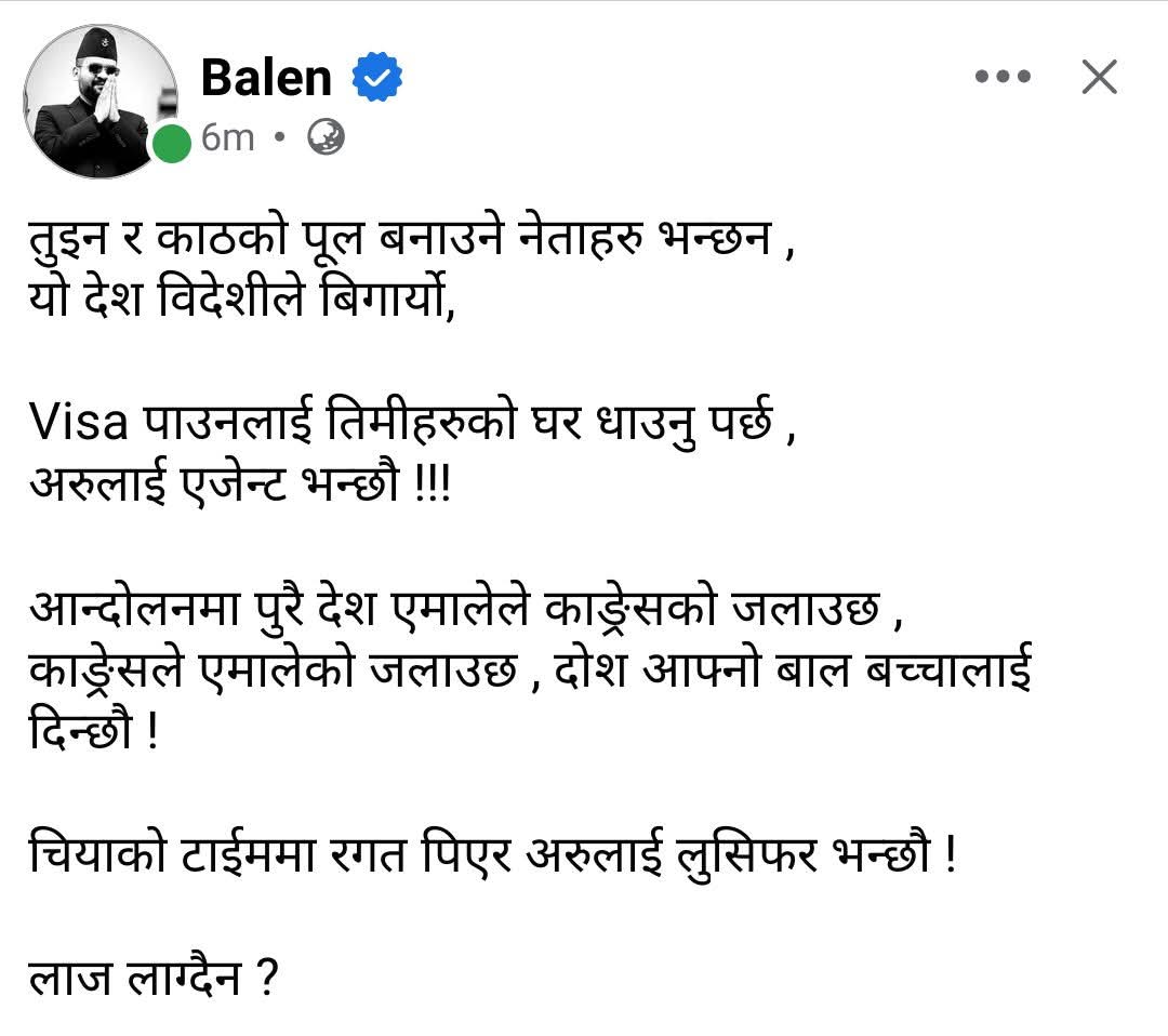 काठमाडौं । काठमाडौं महानगरपालिका मेयरले राजनीतिक दलका नेताहरू लक्षित कडा स्टाटस सामाजिक सञ्जाल फेसबुकमा पाेस्ट गरेका छन् । पोस्टको नेभिगेसन एपेक शिखर सम्मेलनअघि उत्तर कोरियाद्वारा ब्यालेस्टिक मिसाइल प्रहारदीपिका र रणवीरले पहिलो पटक सार्वजनिक गरे छोरी दुआको तस्बिर